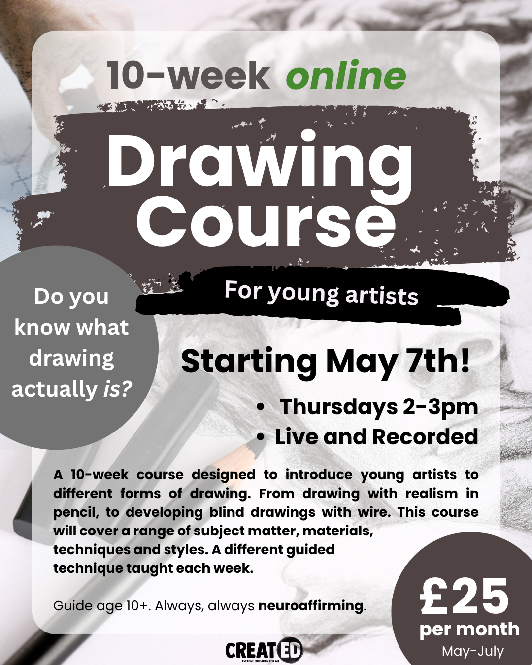 Do you know what drawing actually is? This 10-week course will introduce young artists to different forms of drawing. From drawing with realism in pencil, to developing blind drawings with wire. This course will cover a range of subject matter, materials, techniques and styles. A different guided technique will be taught each week.